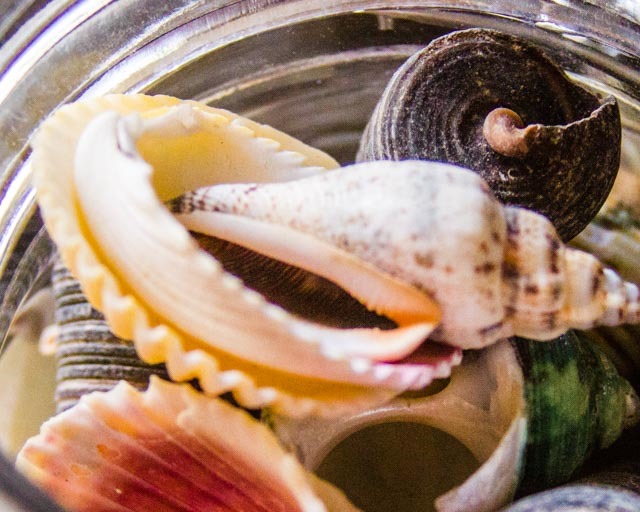 I love sea shells, the colors, the textures, the coolness of them in my hand. However, I don’t get to the coast often enough to collect them myself. So, I resorted to buying some from a local craft store. I keep a jar full of these shells on my piano.