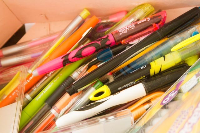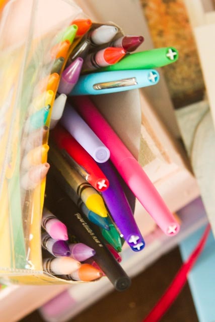 There are my “art” supplies—pens and colored pencils that I keep in a wooden box that once held either Cuties or Halos (mandarin oranges). I am an office-supply junkie as well as an art supply junkie.