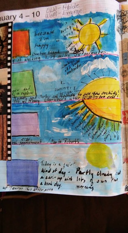 Is it “art”? I have started a daily art journal practice, of sorts, following the ideas of Gina Rossi Armfield’s No Excuses Art Journaling, as well incorporating ideas from Theresa Reobinson’s Right Brain Planner. Each day I record a little bit about my day—a color that I like or that suits my mood, a word to guide me through the day or that expresses my feelings or my mood, a simple drawing of the weather. I use a ittle watercolor, or acrylic paint, a dip pen and India ink and sometimes I write some song lyrics to describe the weather. (Do you know how many songs there are about RAIN? I am beginning to find out!) Another thing I am trying to do is to record more images of the ordinary things around me, not necessarily every day, but several times a week. This week, I have photographed the orchids that are blooming in my home. I have two windowsills full of “moth” orchids, and one oncidium orchid.