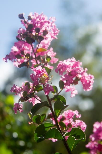The red hibiscus is in bloom, though the purple luna hibiscus is not. The lavender crape myrtle is also still in full bloom. I loved the way the sun was hitting the flowers to create a glow at the top of the flowers. I tried to climb inside the tree for different angles, but I decided the bees could have the interior!