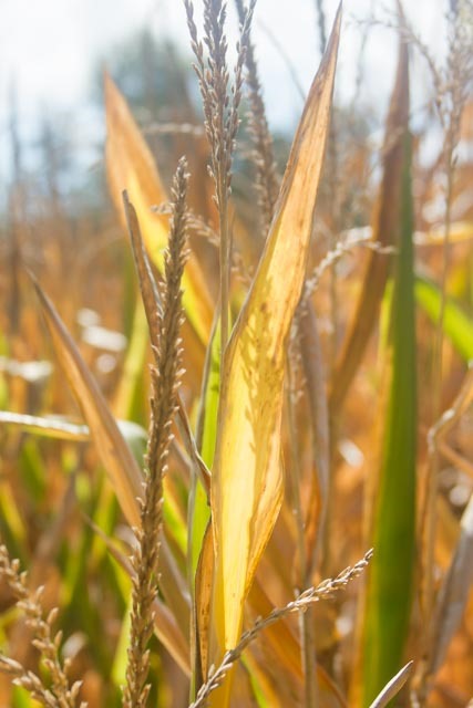 As I rounded the pond, I saw the cornfield, and again I noticed how the light shown through the yellow leaves on the stalk. As I walked around the curve, I saw a ball of brown fur with a corn stalk in its mouth. I was so busy trying to figure out what the creature was that I forgot to take a picture! It was a muskrat!