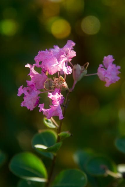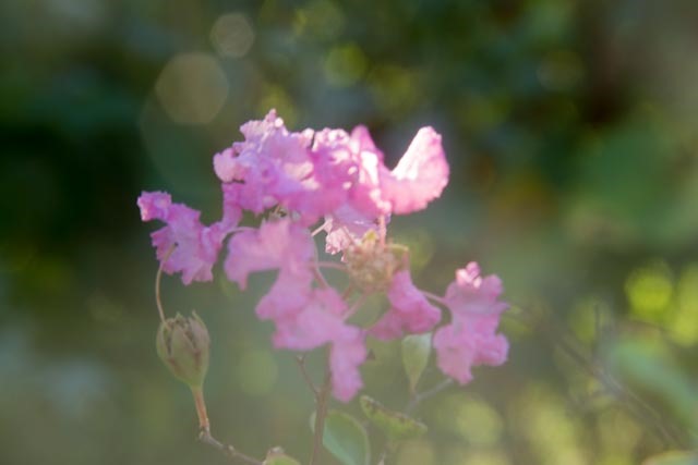 I’ll share some of the images I took today. I set my camera on aperture priority at f/11. This setting allowed my subject to be in sharper focus but still achieve some lovely bokeh. See those little circles of light in the background? That’s bokeh. Those crape myrtle blooms are in sharp focus and the background is out of focus.
