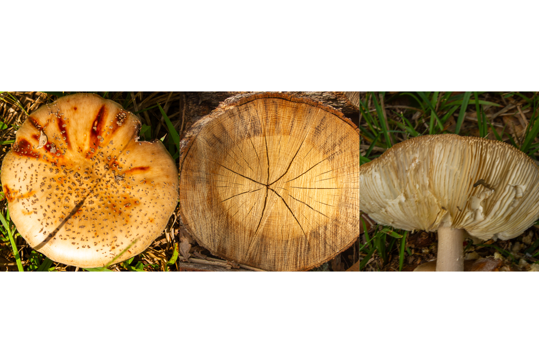 The other part of the challenge in the group is to find a pattern in the images and create a collage of images that either repeats the pattern or creates a pattern, such as a pattern of shapes, colors, subjects, and the like. I found some mushrooms in the side yard and the logs in the wood pile. When I went through my images, I noticed the pattern of colors and shapes. I created this triptych:
