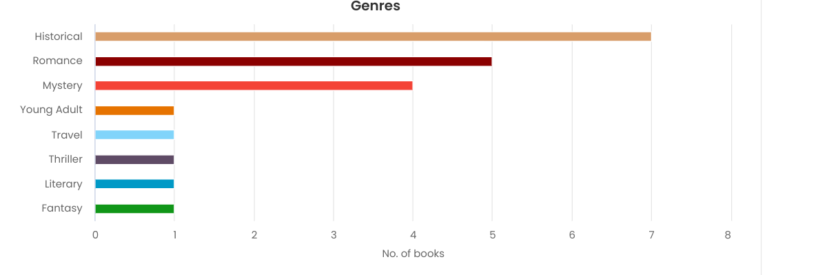 My StoryGraph chart reveals that I am certainly partial to mysterious and adventurous novels, but to be realistic, most of those are historical mysteries.