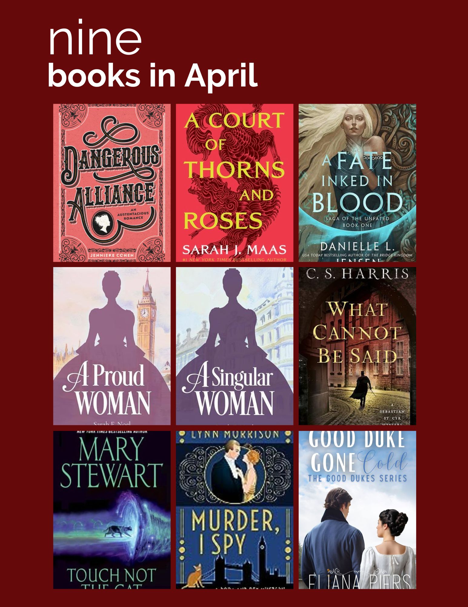 April was a productive month for reading. I read nine books, two of which were audio books, and started two others. Most of the books were “fluff”–easy and escapist reads (yes, they were Regency historical for the most part. Sorry, but those are my guilty pleasures.)