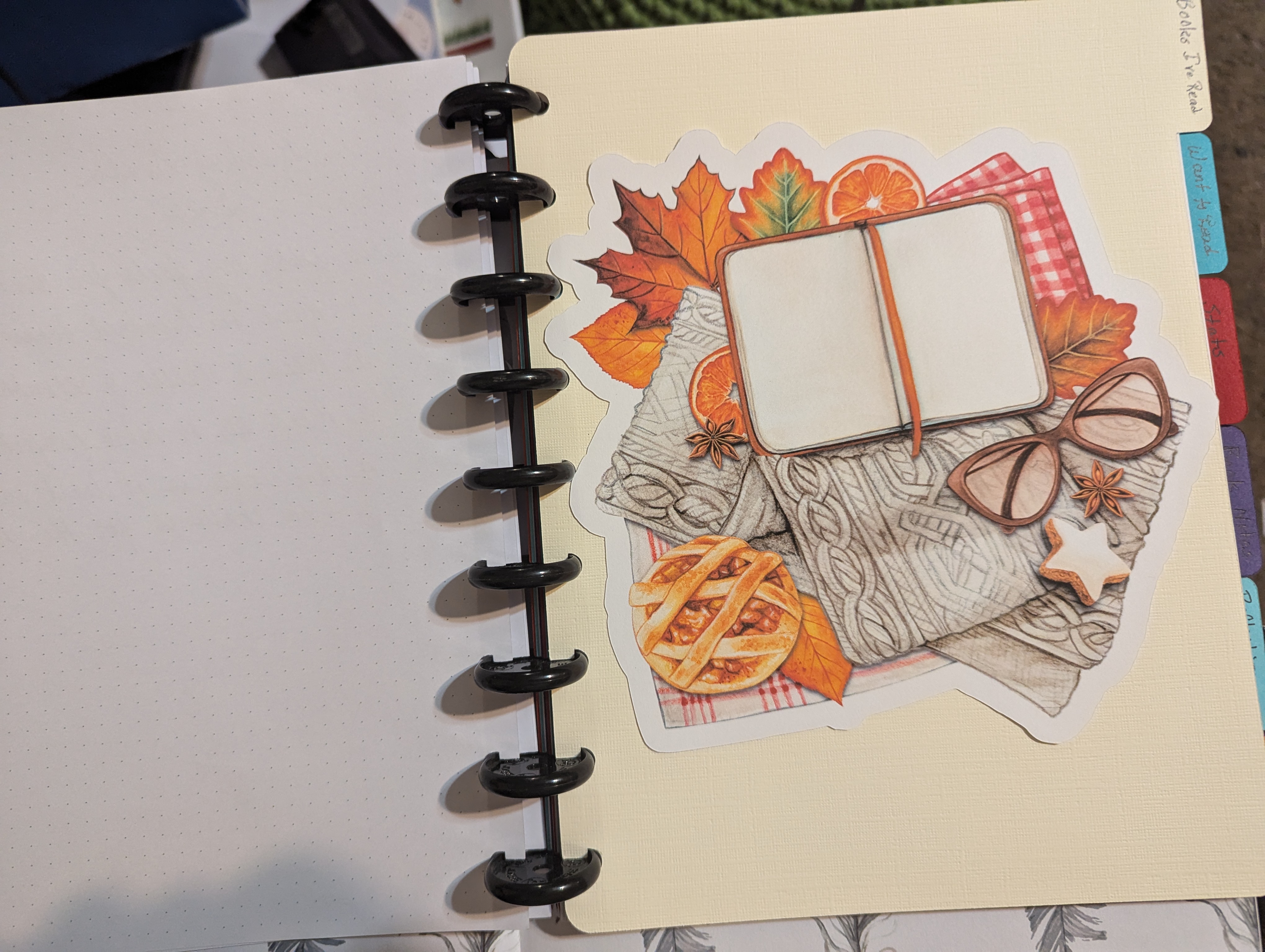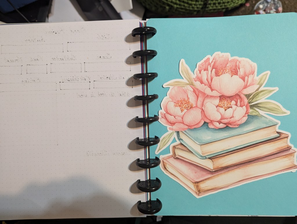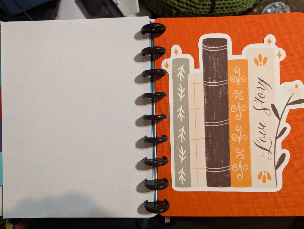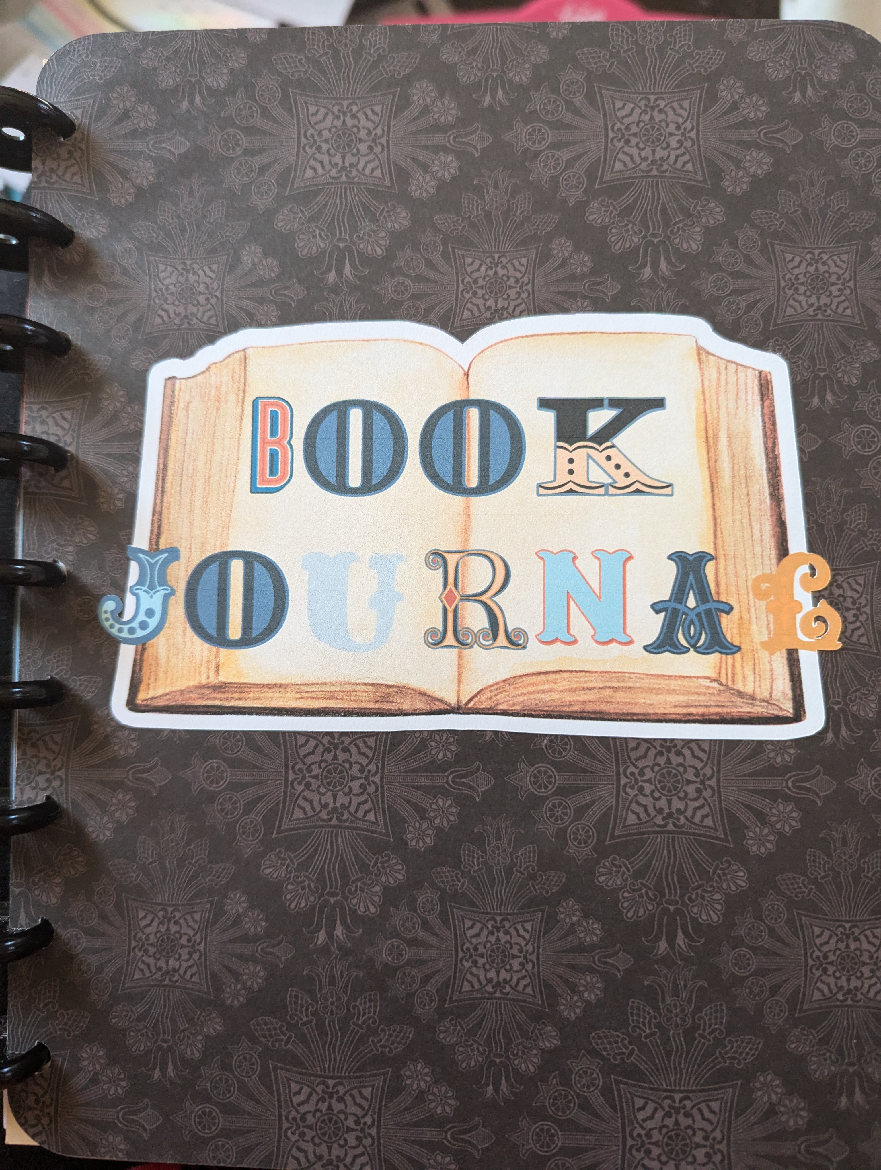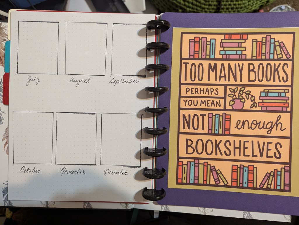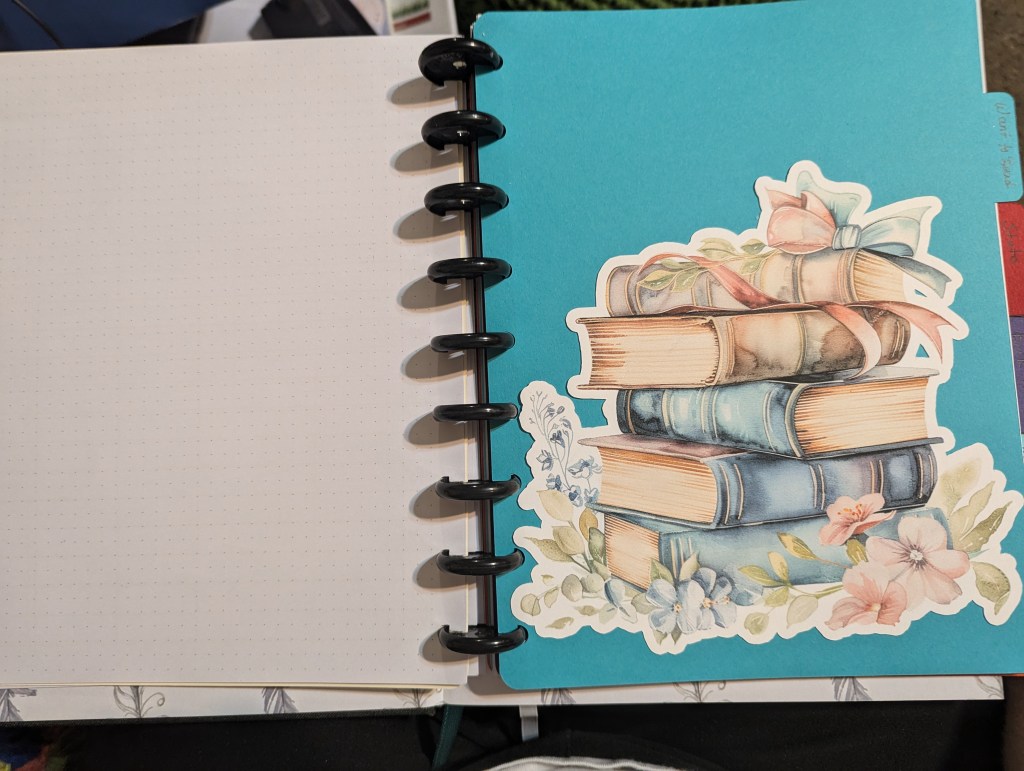 Yesterday afternoon, I “retreated” to the so-called craft room to make stuff. Thanks to Cricut’s Print-and-Cut feature, I printed out some extra-large “stickers” on card stock to cut and used a template from an Etsy seller to make dividers for the different sections of my book journal. Today I added a cover made of patterned paper and a combination of print-and-cut designs. I decided not to put the date so that I could reuse the cover and/or add to the journal in the future.