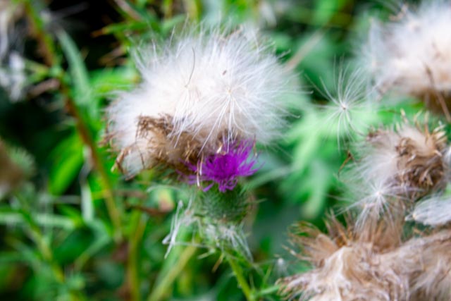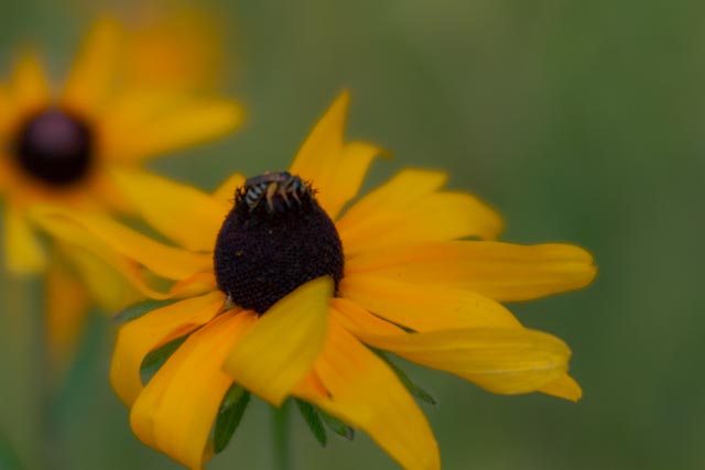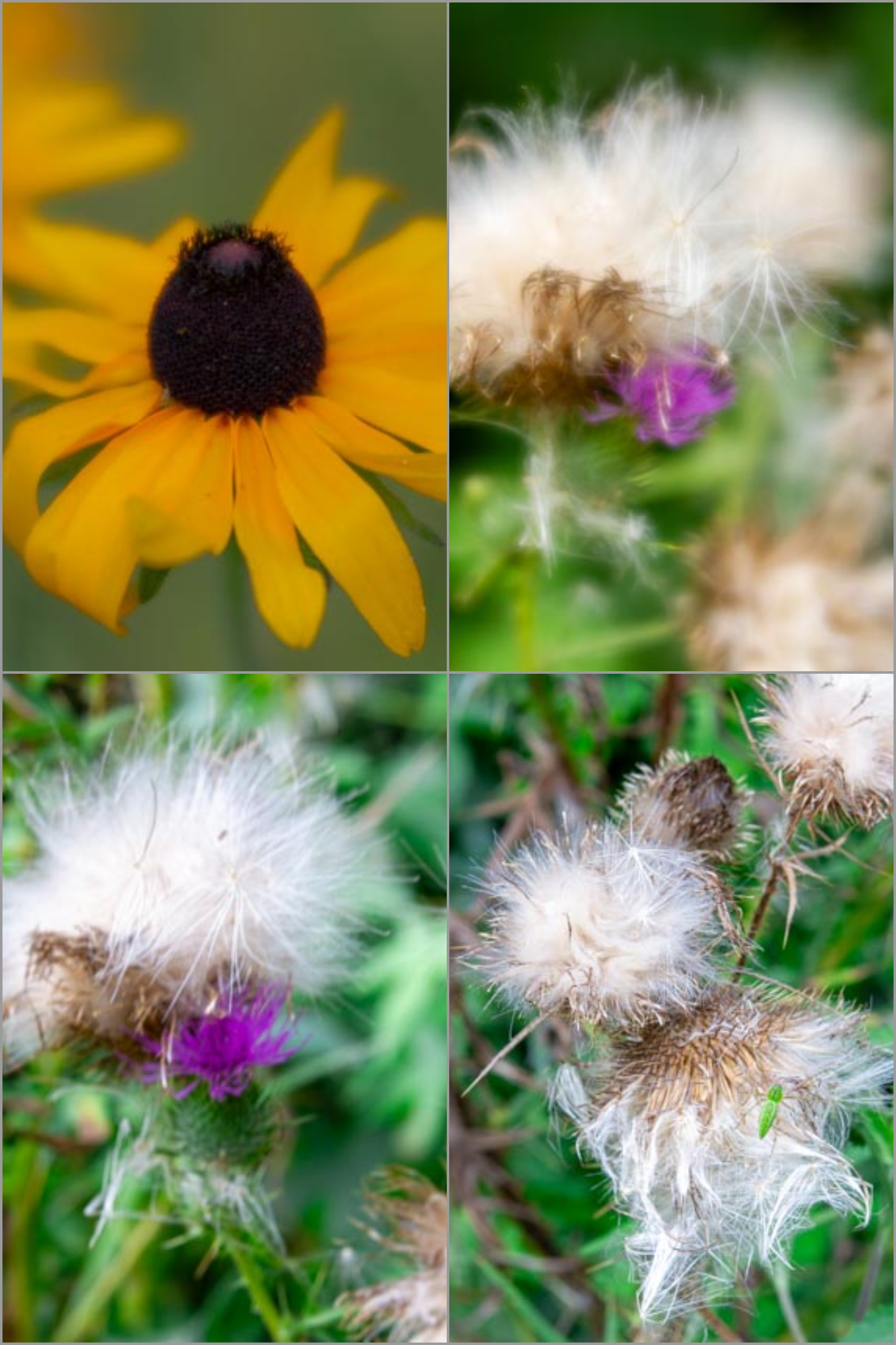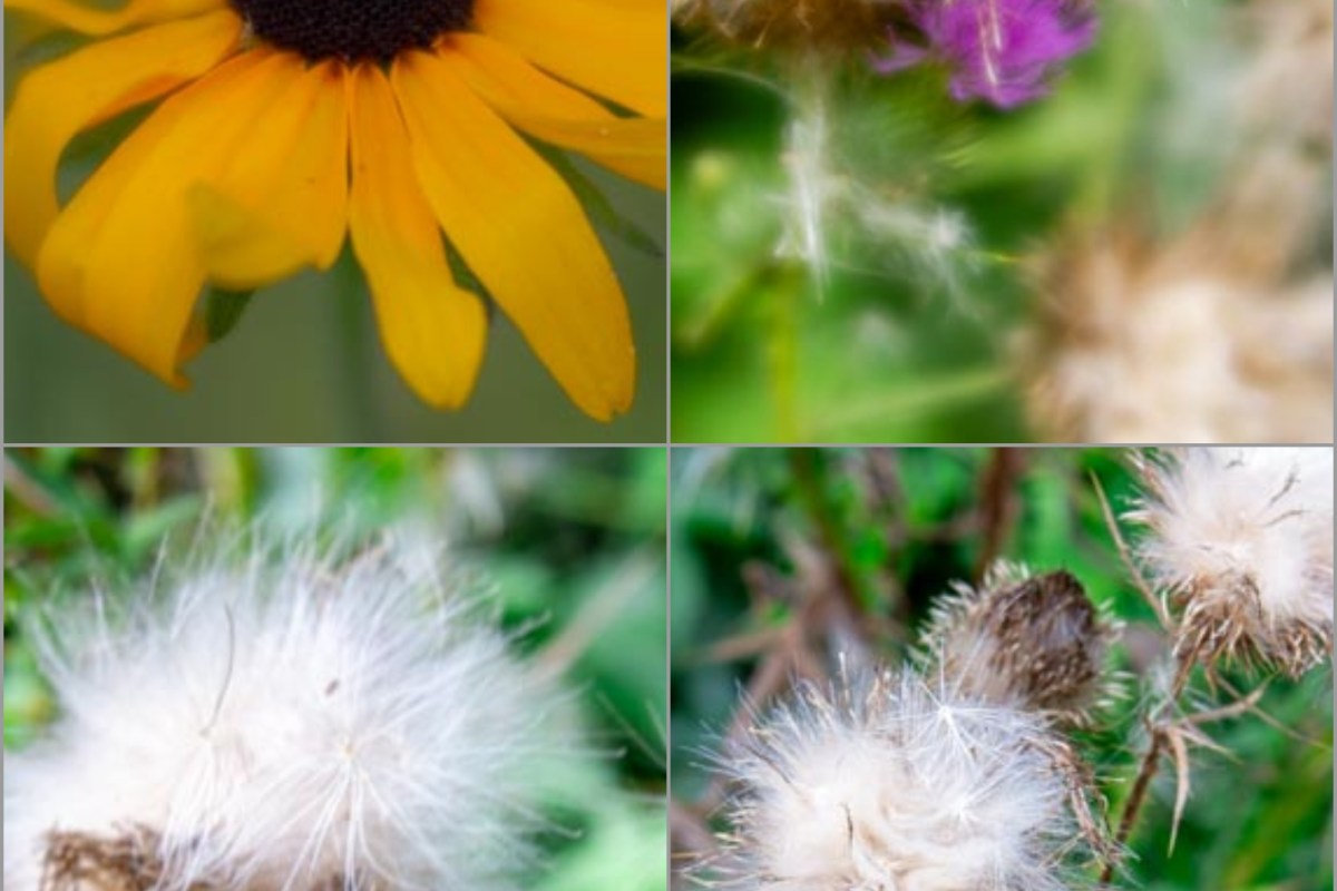 A subject that has caught my eye in the last several walks through the yard is the common thistle plant growing at the edge of the woods in the front yard. I have photographed it when it was in full bloom with lovely purple flowers and now when it is the fluffy seed head stage. Those seeds are ready to spread themselves in the wind. The yellow black-eyed Susans (or are they coneflowers?) are also in bloom now. I even catch the yellow jackets or honey bees or whatever insect they are on them. The bees belong on those flowers. The seeds are ready to leave the plant.