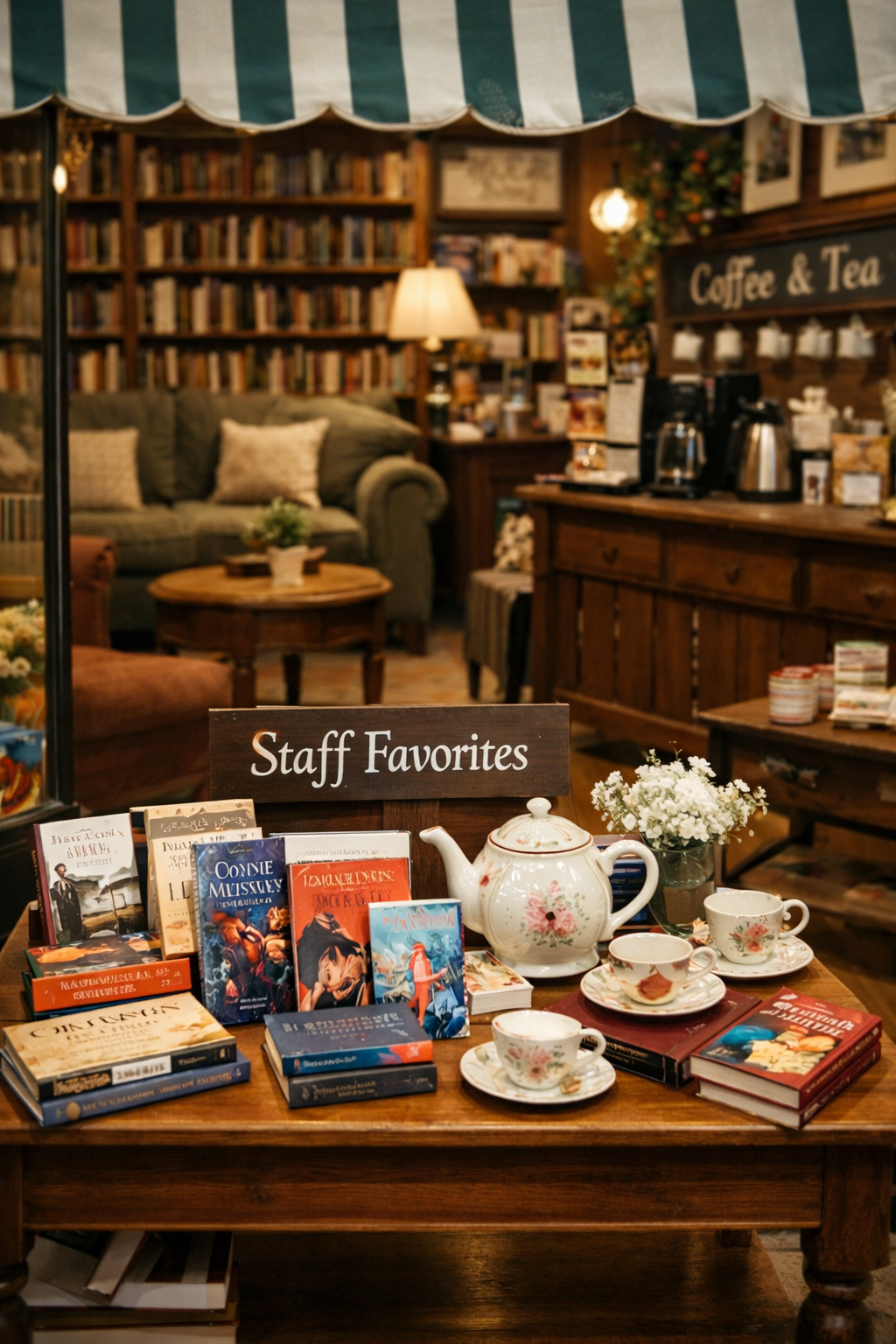 There would be a small self-service coffee and tea bar—nothing fancy, just a coffee pot, flavored creamers and sweeteners, a hot water dispenser, and a variety of teas. Perhaps a few pastries for snacking. The windows would display seasonal books as well as bestsellers. Soft “reading music” would play in the background—instrumentals, classical pieces, or quiet piano solos.