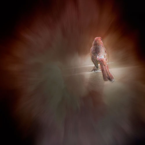 I cropped the image to a square. Then I used some techniques from Susan Tuttle’s book Digital Expressions to desaturate the background while keeping the color of the subject (the cardinal) and creating a vignette with a color fill layer. This is the result:
