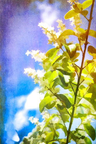 More of the color of the texture layer is retained but there is less texture on the main flower. I still have painterly look but with a more muted flower color. I could go back to the layer mask and brush out some of the color as I did with the image above, or I could lower the opacity of the layer itself. It’s your personal taste and your vision for the image.