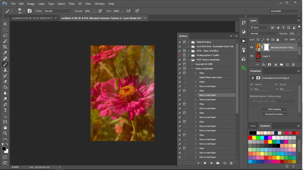 I confess: I “cheat.” I use the MCP free Texture Applicator action to apply textures to images. It’s easy to use: just a few clicks, and the texture is imported into Photoshop and placed over the image; then drag the corners to resize if needed, double-click on the image, and the texture is placed. Of course, there are some tweaks—blending mode, opacity, and the like.