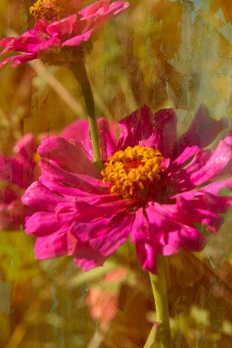 I want to add some fall color to this image as this is probably some of the last of the zinnias that will bloom in my little garden before frost. I don’t really need texture because the background has plenty of it. I want the texture to create a mood, though, that is not present in the original.