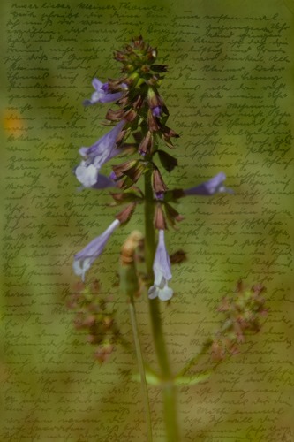 In the second image, I did a web search for a vintage postcard that had a vertical orientation rather than a traditional horizontal one, and I didn’t find what I was looking for. I did find a page of script that I liked. I used the script as an overlay over the image of the wildflower (I don’t know what it is), used a soft brush to mask out the script over the flower, applied a Denise Love texture and a custom gradient to unify the elements.