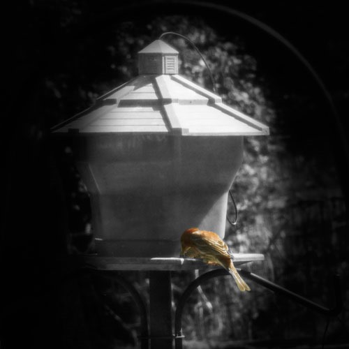 I had ordered Susan Tuttle’s book, Digital Expressions, which is a a collection of tutorials for creating digital art in Photoshop Elements. Last night I began working through a couple of the first ones, the easier ones. Lesson one, as I call it, is how to create a vignette, while the second lesson is about creating a pop of color. Well, my finch is not exactly brilliantly colored, but I did want to isolate him and let him be the focal point in the image. I could have cropped the image closer, but I wanted the context of the feeder. So I combined the two lessons.