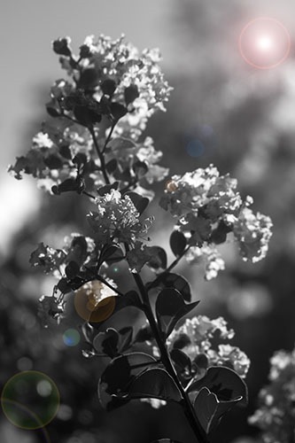 The second image I played with is of some pink crape myrtle blooms. I used the same basic process of conversion to black and white in Lightroom that I described above, but then I took the image into Photoshop for additional manipulation. I used the “Render” filter to add a lens flare. Adding the lens flare added small bits of color back into the image.