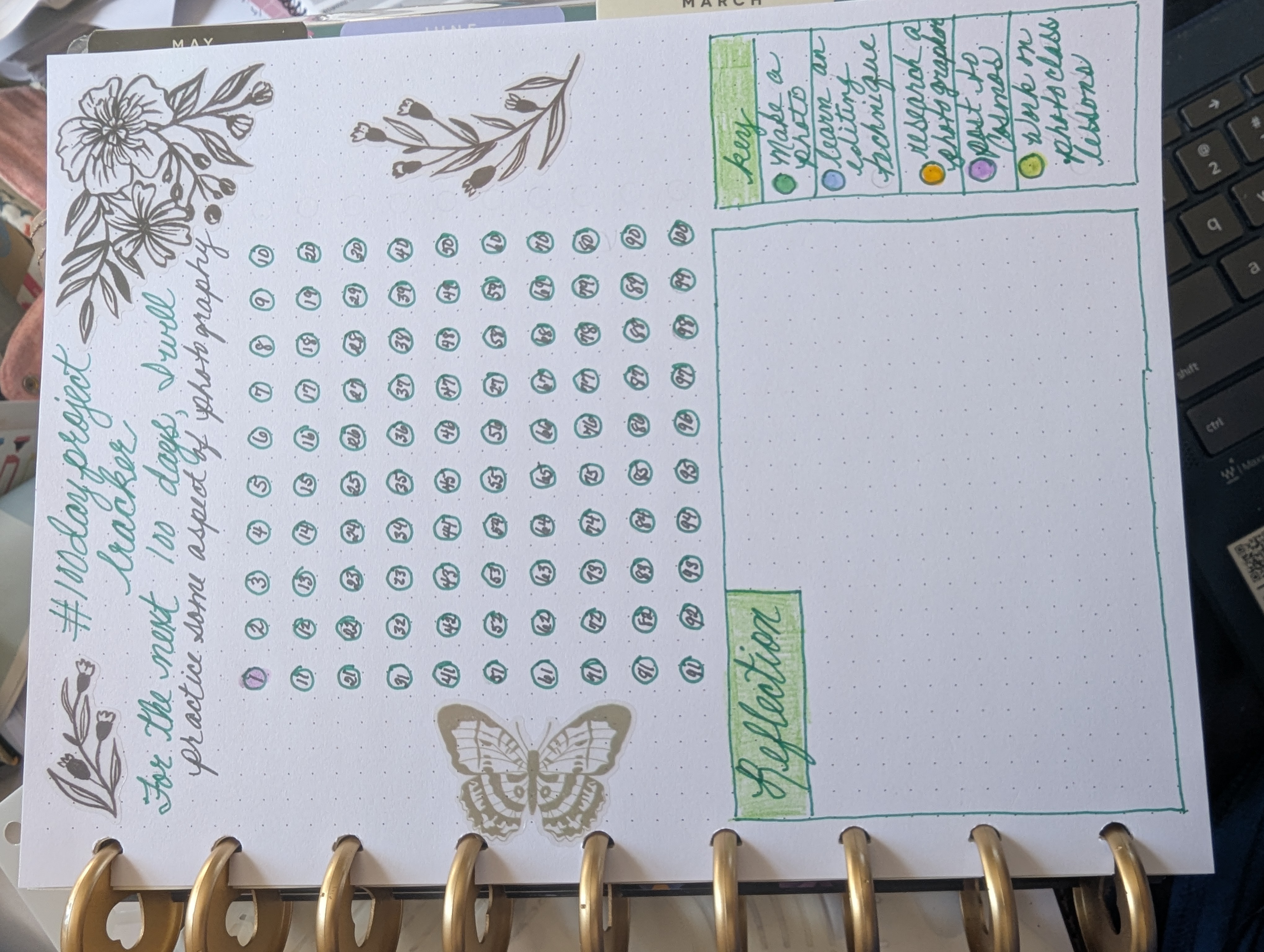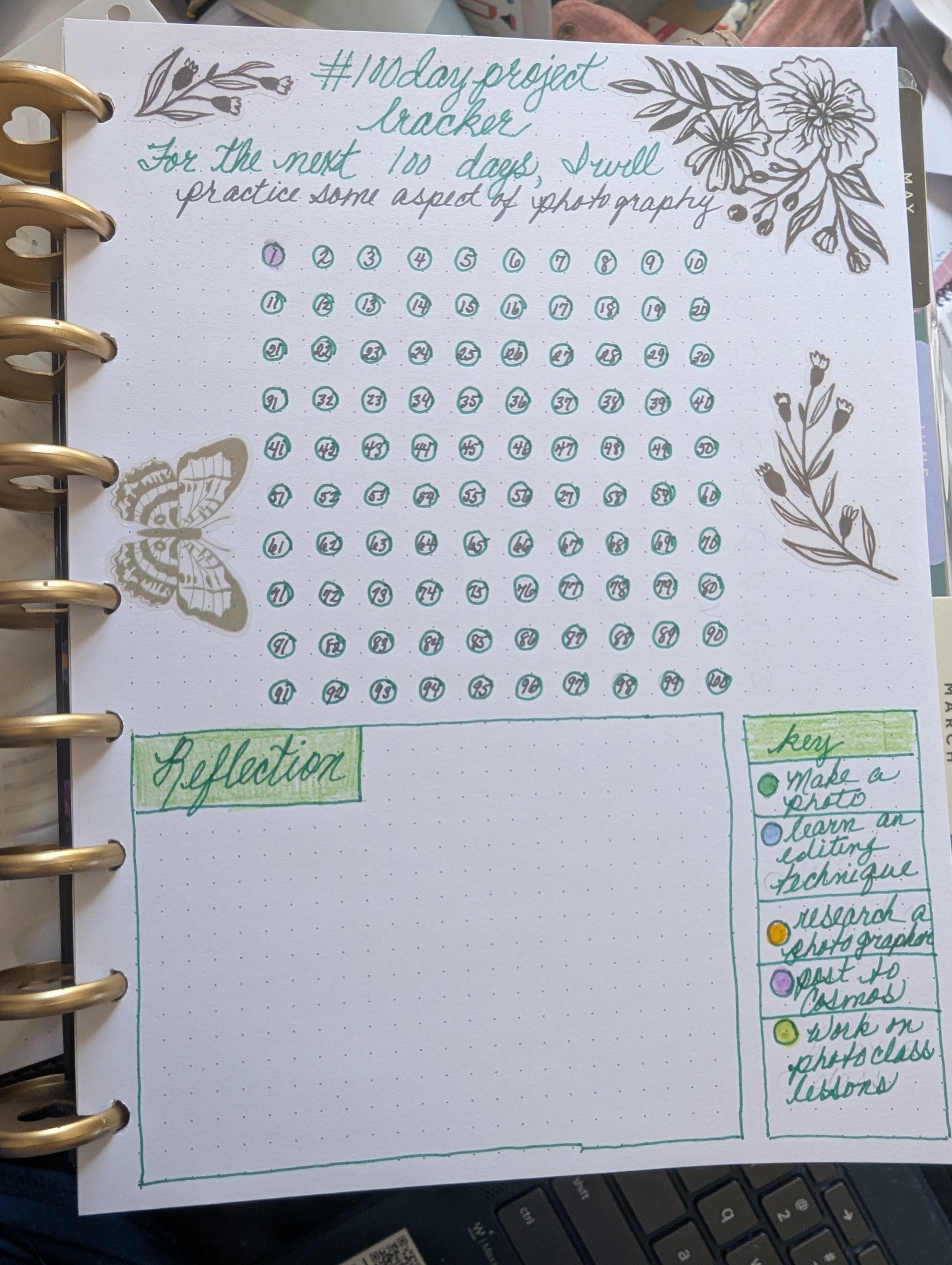The morning pages are just part of a larger practice for the year. My word for this year is EXPLORE, and one element I want to explore is self-expression through “art”–writing, photography, doodling, drawing, etc. So, my 100 Day Project will center around developing my photography skills. I have set up five ways to work on this goal: