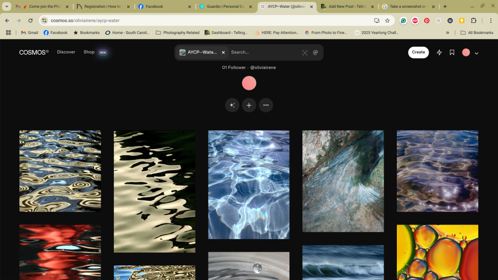 Post things in Cosmos. Kim Klassen introduced Cosmos in a short four-week class last fall. Unlike Instagram, there is no need to write commentary (although there is a way to post notes and text). It’s not so much a social media share-to-brag site as it is a gigantic vision board from which to draw inspiration. By creating clusters around topics, I can search for inspiration and add photos, quotes, and videos to use as reference.