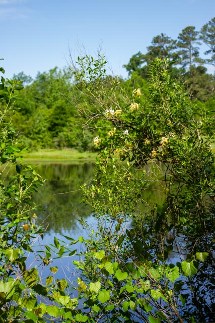 Yesterday, I made a fast foray into the jungle of the front yard. It was a typical July day in South Carolina–hot and humid, though the humidity had not yet reached the level of “air you can wear”. Still, if I had walked all the way around all seven ponds and through the “back forty,” I would have been hot and sticky when I came in. I took out my older Canon EOS 7D with the Lensbaby Velvet 56 lens to make some images. I am out of practice with fully manual modes of photographing. I kept forgetting to check the exposure before pressing the shutter button. I had to make numerous post-processing corrections in Lightroom.