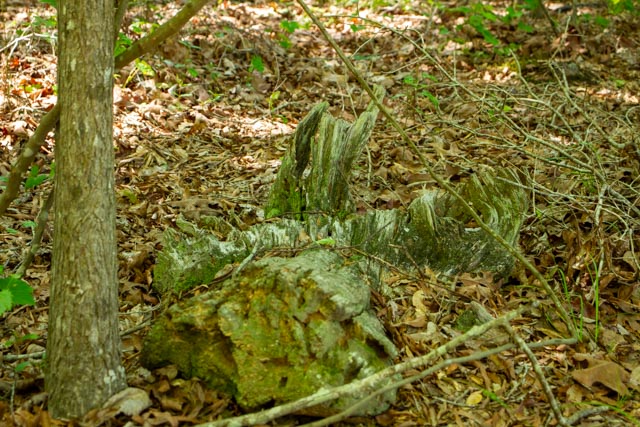 What caught my eye today, though, were textures and colors. The floor of the woods is covered with brown leaves, but there are pops of green all over–plants and moss in particular. There are fallen tree trunks and branches to step over and walk around. I had to be careful of the stump holes. And there were the pointed stumps of small trees the beavers cut down.