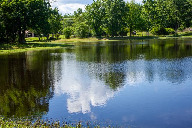 I am amazed by what I see in the landscape of that big two-acre pond (known to family as “The Big Pond”): turtles sunning themselves on the bank, fish darting through the weeds growing thickly in the shallow water at the edge of the pond, clouds reflected on the smooth surface. Clouds billow above. Deer creep out of the woods to drink from it and to eat the vegetation that grows there. Red trumpet flowers fall from the vines growing high in the treetops. Breezes ripple the water. Dragonflies dart from dandelion blossom to blossom. Cicadas and grasshoppers chirp, hidden away by the grasses, weeds, and wildflowers. Blackberries ripen to the darkest purple at the edge of the woods. White and yellow fleabane bloom as stars fallen to earth.