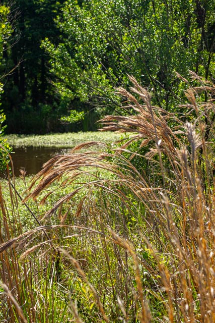 Last week was a bust as far as taking daily photos. The weather wasn’t very cooperative. Today, it was pleasantly in the 70s when I went out; the sun was shining. There was a light breeze, and the sky was blue with some puffy white clouds. My macro/close-up filters came yesterday, and I wanted to try them out. The camera battery was fully charged. I put on my socks and shoes, grabbed my gear, went back into the house for my hat to keep my hair out of my face, and set out for a trip around the pond.